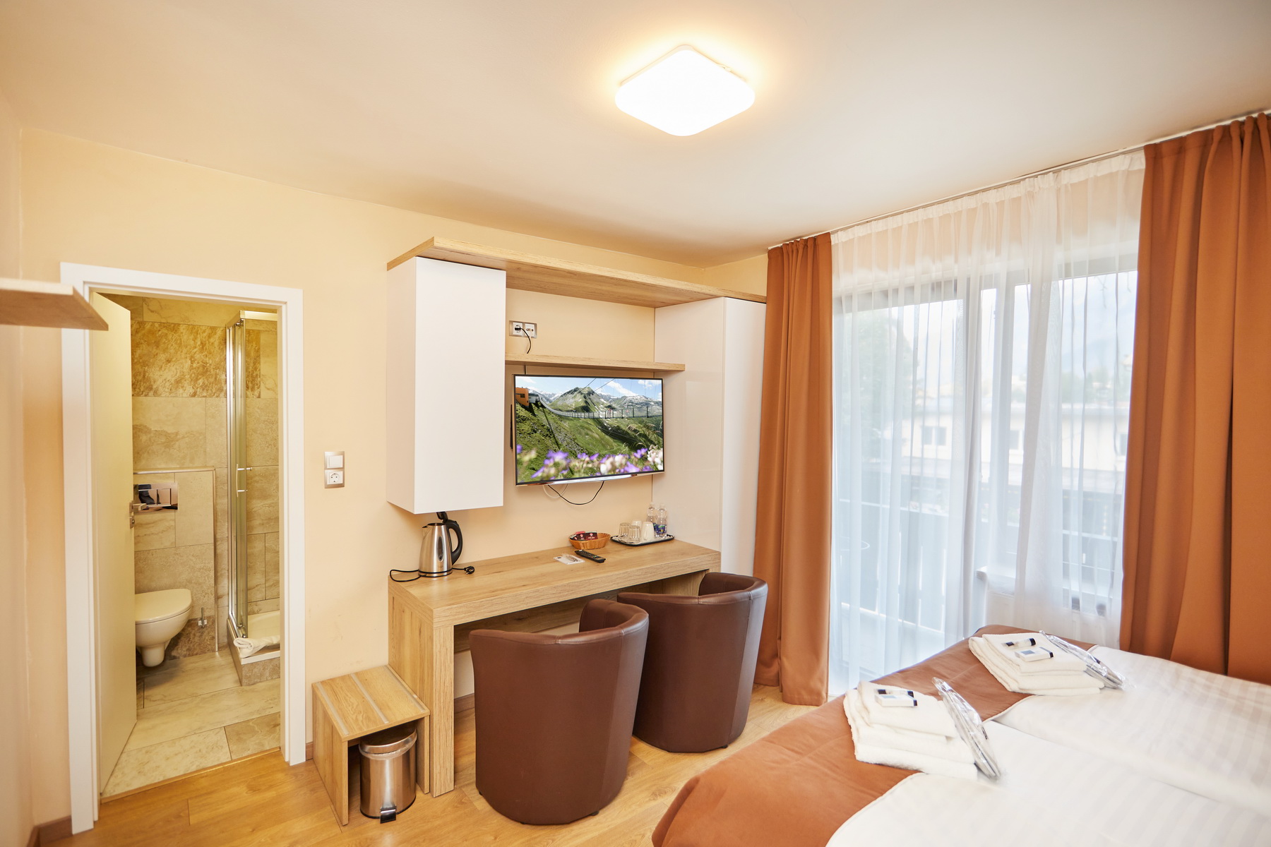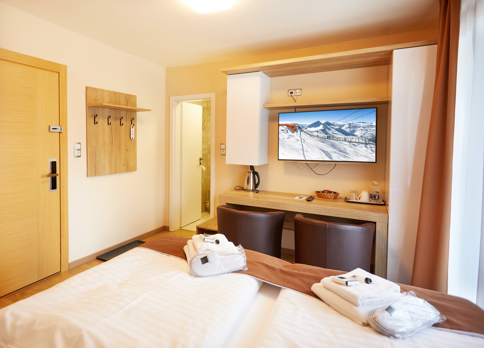 - bett: Doppelbett (in einigen Zimmern mit der Möglichkeit, es in 2 Einzelbetten zu trennen), Nachttische