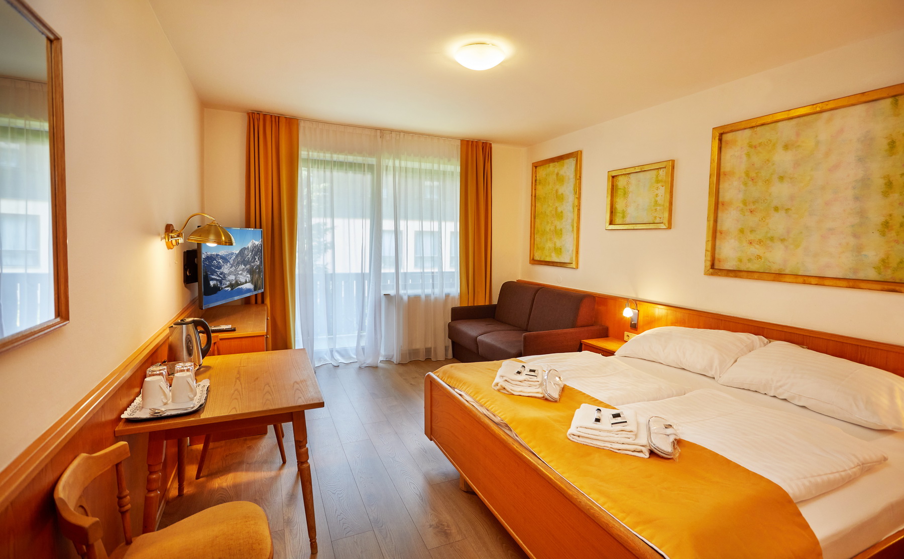 • bed: double bed (in some rooms with the possibility of separating into 2 single beds), bedside tables
