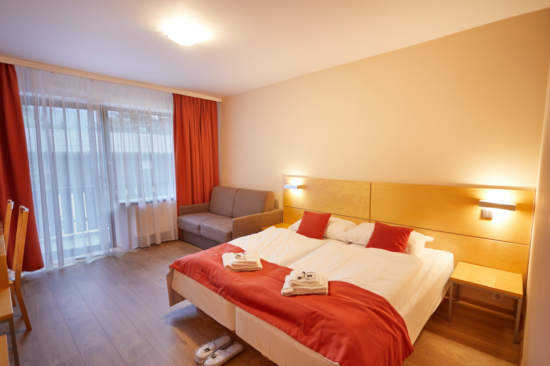 • bed: double bed (in some rooms with the possibility of separating into 2 single beds), bedside tables