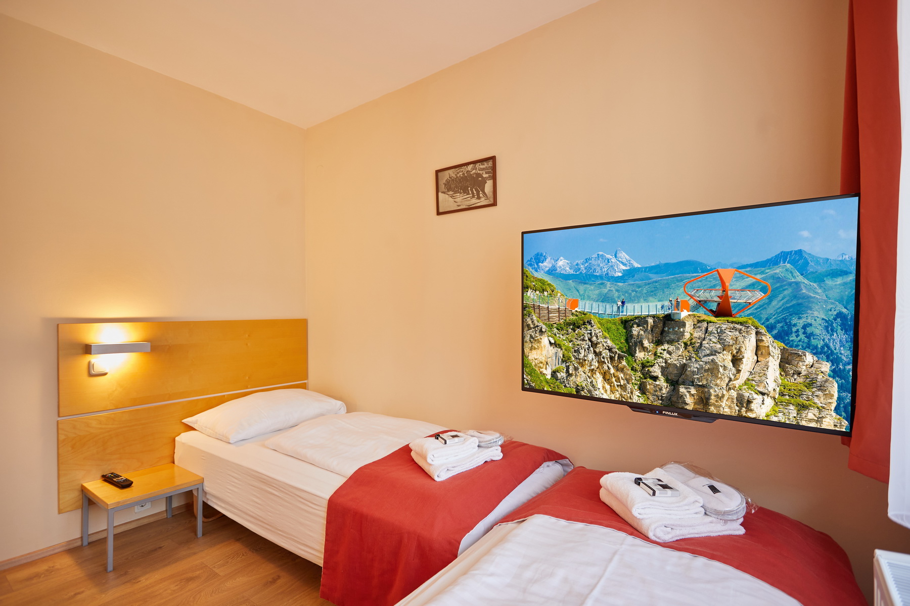 - postele: dvoulůžková postel + 2 x jednolůžková postel, noční stolky